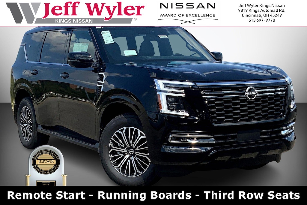 $5,872 off MSRP! Jeff Wyler Kings Nissan is pleased to offer this fantastic 2026 Nissan Armada Platinum in Super Black. Well equipped with: 4WD, 12 Speakers, 3rd row seats: split-bench, 4-Wheel Disc Brakes, ABS brakes, Air Conditioning, Alloy wheels, AM/FM radio: SiriusXM w/360L, Anti-whiplash front head restraints, Apple CarPlay/Android Auto, Auto High-beam Headlights, Auto tilt-away steering wheel, Auto-dimming door mirrors, Auto-dimming Rear-View mirror, Auto-leveling suspension, Automatic temperature control, Brake assist, Bumpers: body-color, Carpeted Floor Mats with Captain Chairs, Center Front Spoiler, Climate Controlled Heated and Ventilated Front Seats, Compass, Cross Bars, Delay-off headlights, Driver door bin, Driver vanity mirror, Dual front impact airbags, Dual front side impact airbags, Electronic Stability Control, Emergency communication system: NissanConnect Services, Four wheel independent suspension, Front anti-roll bar, Front Bucket Seats, Front Center Armrest, Front dual zone A/C, Front fog lights, Front reading lights, Fully automatic headlights, Garage door transmitter: HomeLink, Genuine wood dashboard insert, Heated door mirrors, Heated front seats, Heated rear seats, Heated steering wheel, HVAC memory, Illuminated entry, Illuminated Kick Plates, Knee airbag, Leather steering wheel, Low tire pressure warning, Memory seat, Navigation system: Google Maps, Occupant sensing airbag, Outside temperature display, Overhead airbag, Overhead console, Panic alarm, Passenger door bin, Passenger vanity mirror, Power door mirrors, Power driver seat, Power Liftgate, Power moonroof, Power passenger seat, Power steering, Power windows, Quilted Leather Seat Trim, Radio: NissanConnect with SiriusXM 360L, Rain sensing wipers, Rear air conditioning, Rear anti-roll bar, Rear Bumper Protector, Rear reading lights, Rear window defroster, Rear window wiper, Reclining 3rd row seat, Remote keyless entry, Security system, Speed control, Speed-sensing steering, Speed-Sensitive Wipers, Splash Guards, Split folding rear seat, Spoiler, Steering wheel memory, Steering wheel mounted audio controls, Tachometer, Telescoping steering wheel, Tilt steering wheel, Traction control, Trip computer, Turn signal indicator mirrors, Variably intermittent wipers, Ventilated front seats, Voltmeter, and Wheels: 20" x 8.5J Machined and Painted Alloy.Wyler Family First Package Includes: NanoCure Appearance Protection: Exterior & Interior Chemical Sealant Applied to Protect Against Environmental Hazards (7 Year Warranty Coverage). Pulse- Rear end Collision Avoidance System Theft Deterrent Strategy gives you 5 Years of Coverage against vehicle Theft, Offering up to a $5,000 benefit. Used vehicles 10 years of age or newer with less than 100,000 miles are eligible for the Wyler Assurance Program, but eligible vehicles must pass our reconditioning process and multi-point inspection. Provided the vehicle passes inspection, vehicles will be eligible for the 6 month/6,000 mile limited warranty. The 6 month/6,000 mile limited warranty is NOT available on AS-IS vehicles, wholesale vehicles, lease buyback/pass-thru vehicles or un-inspected vehicles. Note that this program can also apply to vehicles where the remaining factory coverage is less than 6 months or 6,000 miles. Please check the Federal Trade Commission (FTC) Buyers guide on the vehicle for full details as to whether or not warranty coverage may apply. Contact Dealer for additional details. The Wyler Assurance 6 month/6,000 Mile limited warranty ends 6 months from the date of the Retail Purchase Agreement (BUYERS ORDER) or when the vehicle's odometer registers 6,000 additional miles to the mileage listed on the BUYERS ORDER, whichever comes first. Your Deductible - The warranty holder on your contract pays the first $100 of each covered repair.